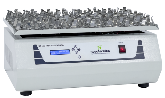 Mesa agitadora Nova Etica: sistema excentrico de agitacao orbital, plataforma ajustavel para fracos padroes, motor de inducao trifasica, trabalho continuo, transmissao com correias e polias, 4 pes anti- vibratorio, ajuste de rotacao micro-processado digital (conversor de frequencia), faixa de trabalho: 20 a 250 rpm, bivolt ou 220 v.