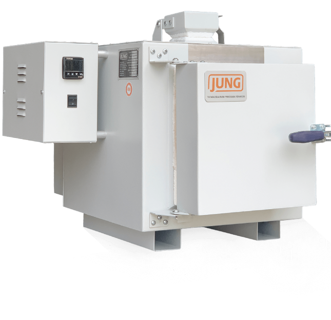Forno para tratamento térmico tipo câmara, sem controle de atmosfera, com controle microprocessado digital de temperatura, aquecimento e resfriamento, taxa de aquecimento de até 40 °C por minuto e patamar máximo de 1700°C.